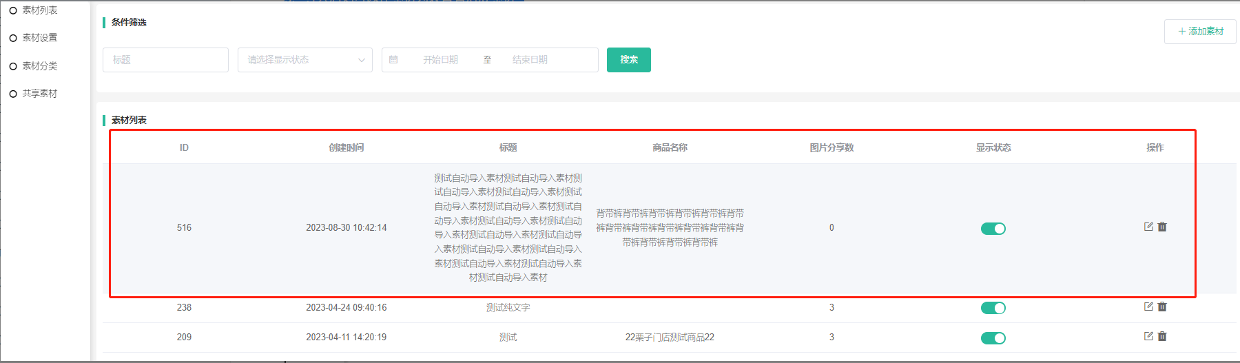 1.素材列表添加素材:设置好素材标题,关联的商品只能选择一件(支持平台所有商品),素材文案,上传好商品图片(图片最多只能上传9张),选择是否显示(选择显示则保存后在前端就可以查看到)