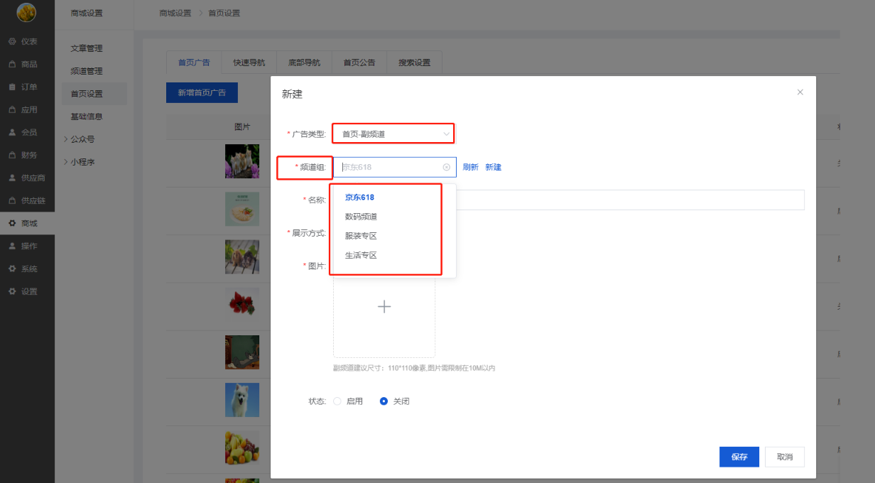 【广告类型】可以选择:首页轮播、首页-主频道、首页-副频道、首页-热销商品、首页-产品专辑、首页-推荐商品;