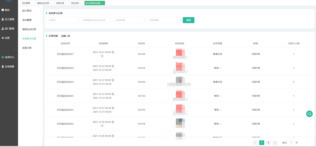 2、 好友裂变:以企业微信成员为载体,进行引流裂变;通过设置奖励积分、爱心值、余额、优惠券(兑换奖品)、会员等级(升级观看免费课程/享受折扣等)等吸引用户,让客户扫码添加企业微信成员为好友、获取专属海报,再邀请若干好友添加企业微信成员,完成邀请后即可获得奖励。