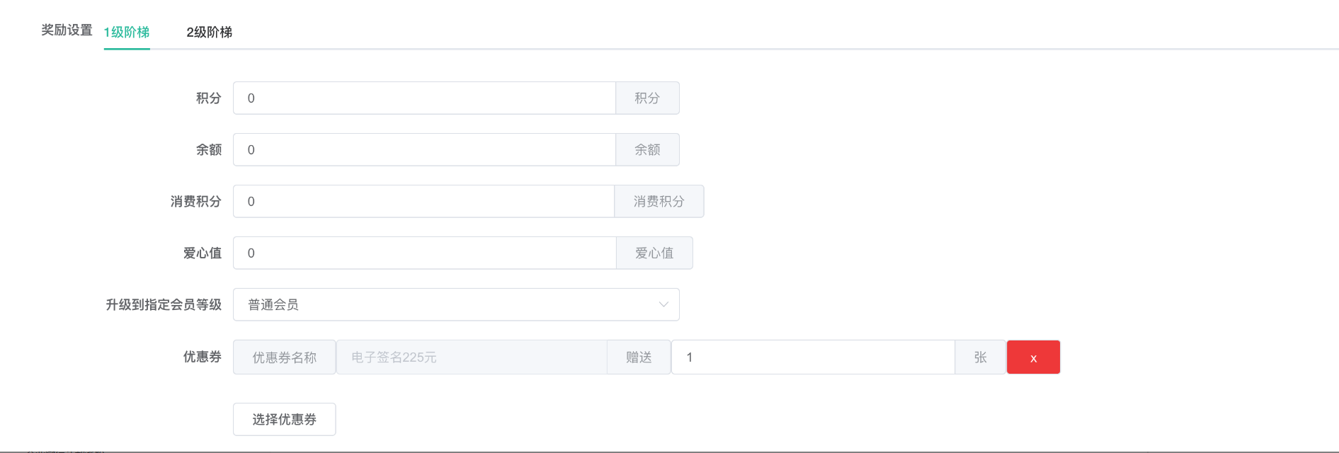 奖励设置:支持奖励积分、余额、消费积分、爱心值、升级到指定的会员等级、优惠券等。