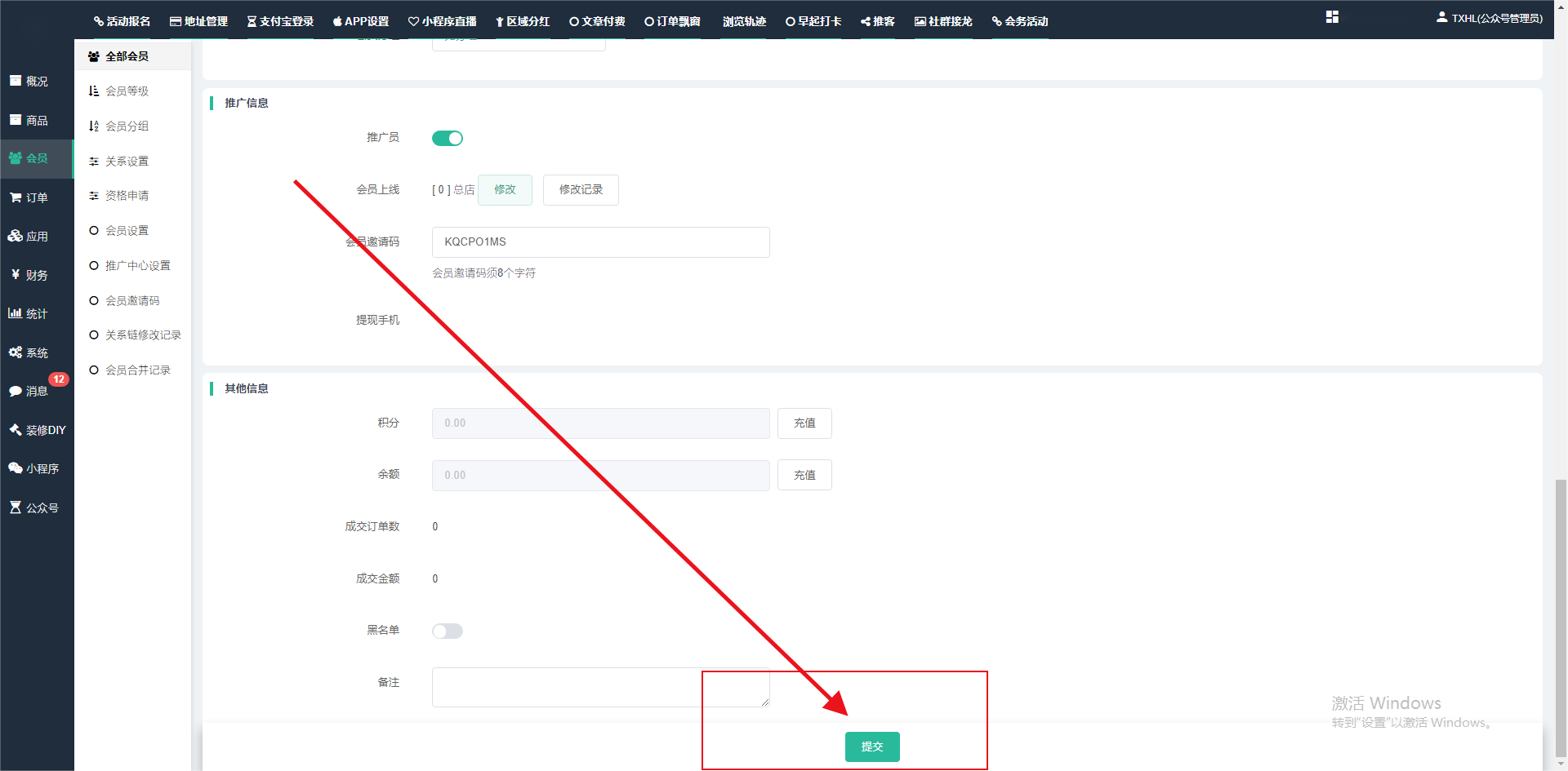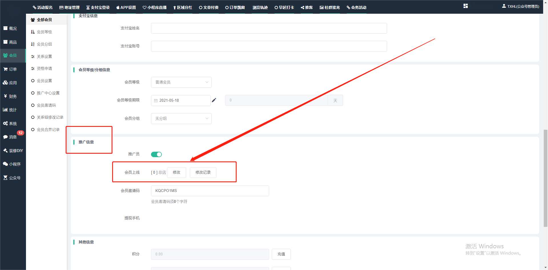 目录 搜索 展开 一、前期准备资料二、数字乡村码-上线操作指南1、服务号的申请流程及认证2、申请小程序流程3、开放平台绑定小程序和公众号三、数字乡村码-系统操作数字乡村码系统管理-概况数字乡村码-商品管理1、发布商品2、商品列表3、商品表单4、商品分类5、品牌管理6、配送模板7、评论管理8、优惠券管理9、商品标签10、退货地址设置11、满额优惠12、批量操作13、配送方式14、基础设置15、商品隐藏四、数字乡村码-会员管理1、全部会员2、会员等级3、会员分组4、资格申请5、会员设置6、推广中心设置7、会员邀请码8、会员关系链修改关系链修改记录9、会员合并记录10、账号注销管理11、会员设置中心五、数字乡村码-订单管理1、订单管理列表2、订单处理流程3、订单状态4、订单修改价格5、订单退款退货6、多包裹发货7、批量发货订单操作步骤8、催发货订单9、物流查询六、数字乡村码-财务管理1、余额设置2、会员余额3、充值记录4、转让记录5、余额明细6、收入明细7、提现设置8、提现统计9、积分管理10、转账审核11、收益广告12、批量充值七、数字乡村码-系统管理1、商城入口2、商城设置①、商城设置②、订单设置③、物流查询④、短信⑤、联系方式⑥、分类⑦、优惠券⑧、分享⑨、幻灯片⑩、广告位⑫、地图设置3、交易设置4、微信模板消息自定义消息模板(新版)自定义消息模板(旧版)小程序消息模板公众号模板消息变更公告5、语言设置6、权限管理7、多媒体管理八、数字乡村码-消息管理九、数字乡村码-应用管理十、数字乡村码系统-数据统计十一、数字乡村码-页面装修DIY1、模板管理2、店铺页面3、顶部导航4、底部导航5、DIY模板市场6、首屏广告7、基础设置8、装修DIY尺寸建议十二、供应商功能插件操作指南1、供应商2、门店-收银台门店申请和使用步骤门店管理①、门店-收银台 营销设置②、门店-收银台 分润设置门店分类门店申请门店审核门店商品门店商品订单收银台订单数据统计核销员基础设置默认设置门店装修3、微社区4、会务活动十三、营销插件操作指南活动报名提货卡新人奖微店问卷调查积分视频分享1、视频分享基础设置2、视频分享发现管理3、视频分享分类管理4、视频分享评论管理5、视频分享分红记录6、视频分享短视频中心每日红包幸运大抽奖签到优惠券二维码任务奖励优惠劵文章音频文章付费文章限时购新海报拓客卡操作流程积分活动素材中心视频红包十四、入驻门店应用类1、门店预约2、附近商品3、门店定位设置4、门店控制5、门店满额包邮6、门店满额减7、导入商品8、门店搜索9、门店股东10、核销券11、多门店核销1、商城后台设置2、前端功能演示十五、常见问题1、后台登录密码修改流程2、会员-余额,积分,后台如何进行充值与扣除3、如何修改上下级关系4、一种万能的获取商城小程序路径的方法 暂无相关搜索结果! 阅读次数:2106 本文档使用 模王系统 发布 3、如何修改上下级关系 如何修改上下级关系一.如何修改上下级关系?1.会员-全部会员-可以通过搜索用户的独立ID,或者用户微信昵称,找到此会员,然后点击右边的(操作)2.再点击会员详情。3.滑到下面,有个推广信息-会员上线,点击修改4.输入上级的ID号,点击搜索,出来此上级会员后点击选择。5.滑到最下面,一定要点击提交按钮。文档更新时间: 2024-01-05 14:50 作者:链上旅行