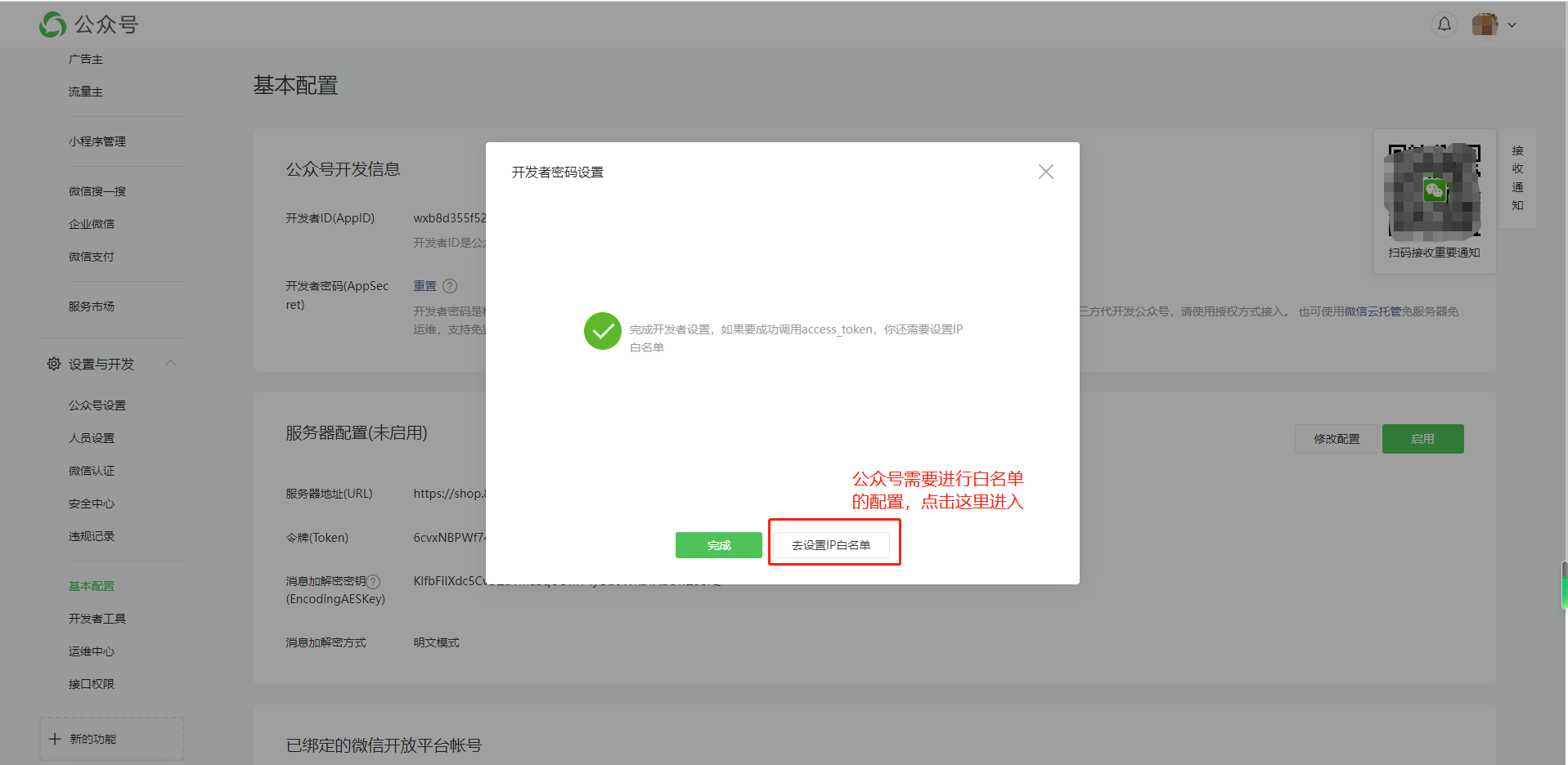 2:点击基本配置,填写开发信息和服务器配置,先设置好密钥、白名单再进行服务器配置。