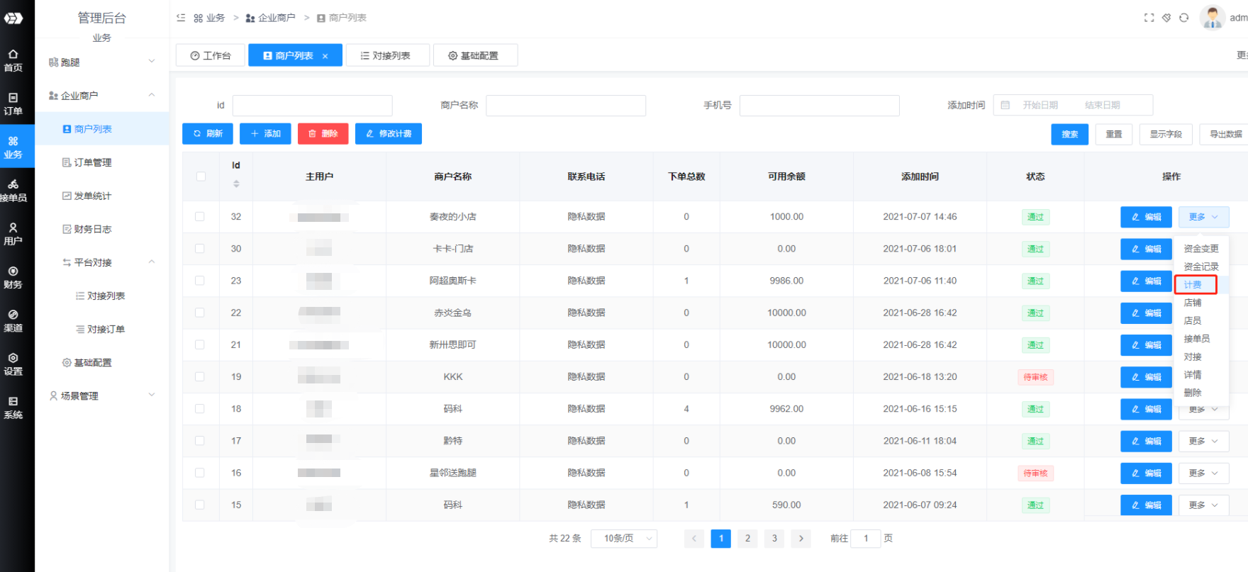 b. 第二种,需要用户在跑腿后台-企业商户-商户列表-添加中添加商户后,在列表中找到对应商户,点击更多-店铺,创建一个店铺并且设置相关信息,之后取企业商户-商户列表中的id,在跑腿配送插件-门店管理-绑定商户-绑定已有跑腿配送系统商户中输入id,执行绑定,如果绑定的跑腿商户之前已经绑定过对接关系了,执行该方法会报错,需要在跑腿后台跑腿后台-企业商户-商户列表-对接中删除对应绑定后再执行。