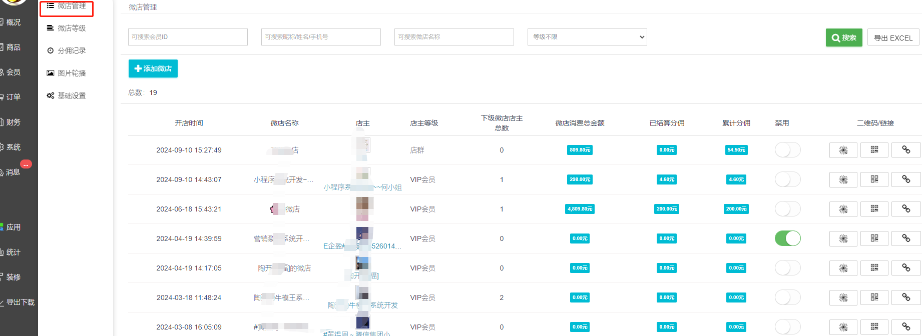 平台通过微店管理列表查看微店店主情况:开店时间、微店名称、店主昵称头像、店主等级、下级微店店主总数、微店消费总金额、微店分红、微店二维码、链接、是否加入黑名单。
