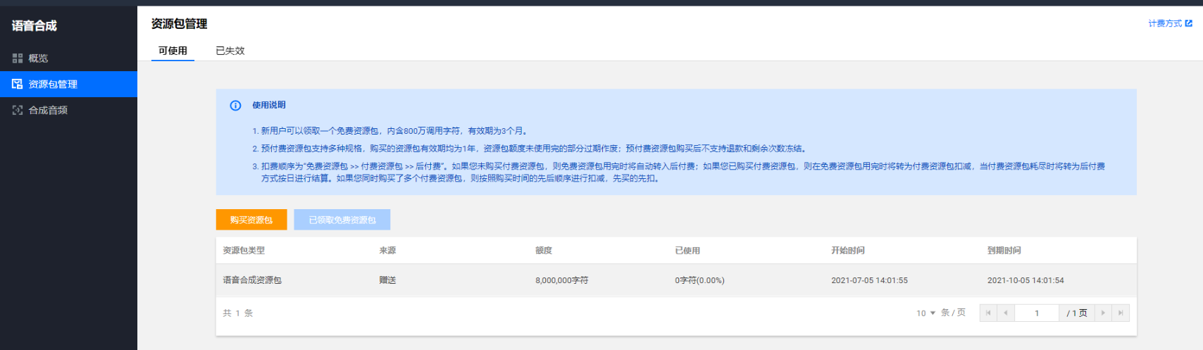 3、进入语音合成--资源包管理,新用户可以领取一个免费资源包,内含800万调用字符,有效期为3个月。到期需付费购买。